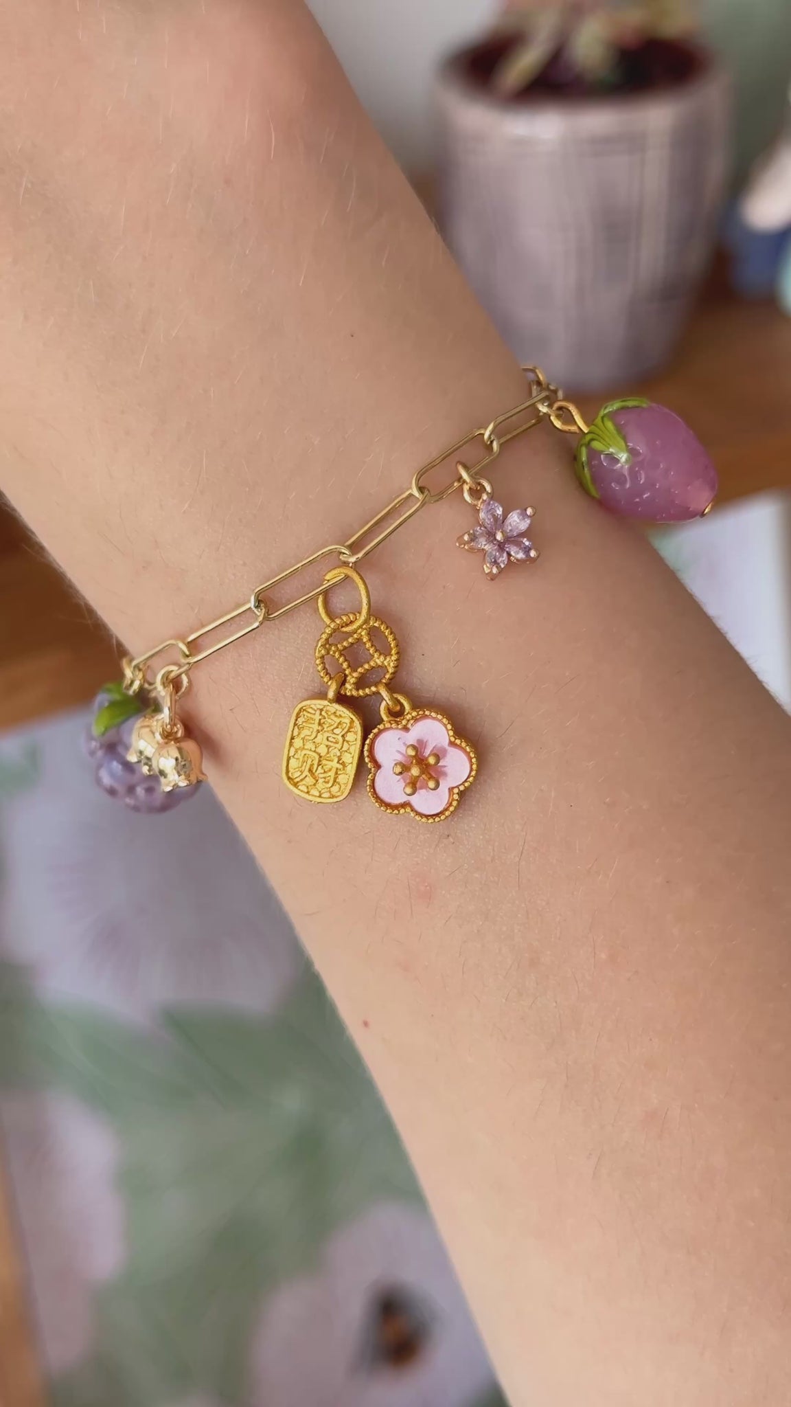 Handmade Bracelet | 14–18k Gold Plated 925 Sterling Silver with Handcrafted Glass Fruits. Featuring a 925 sterling silver chain or a stainless steel chain and sterling silver charms plated in 14–18k gold, adorned with unique, handcrafted glass fruit charms.