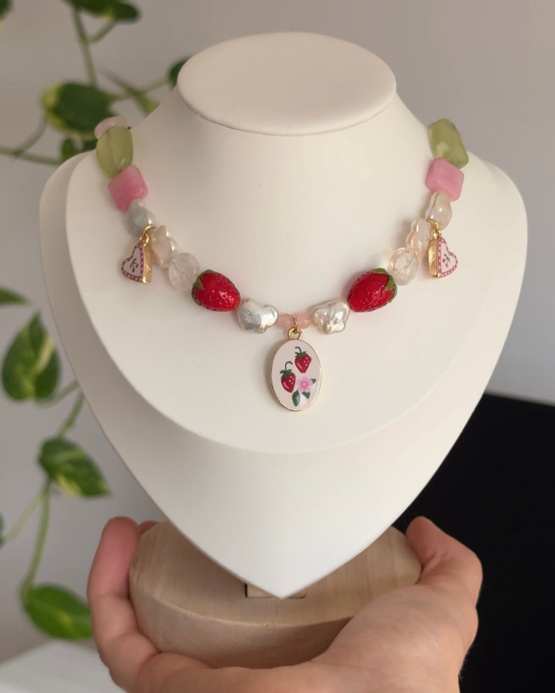 Handmade necklace with a mixture of freshwater pearls, Vintage Czech glass beads, gemstones such as Rose Quartz and Lemon Agate. As well as brass charms and handcrafted glass strawberry charms.