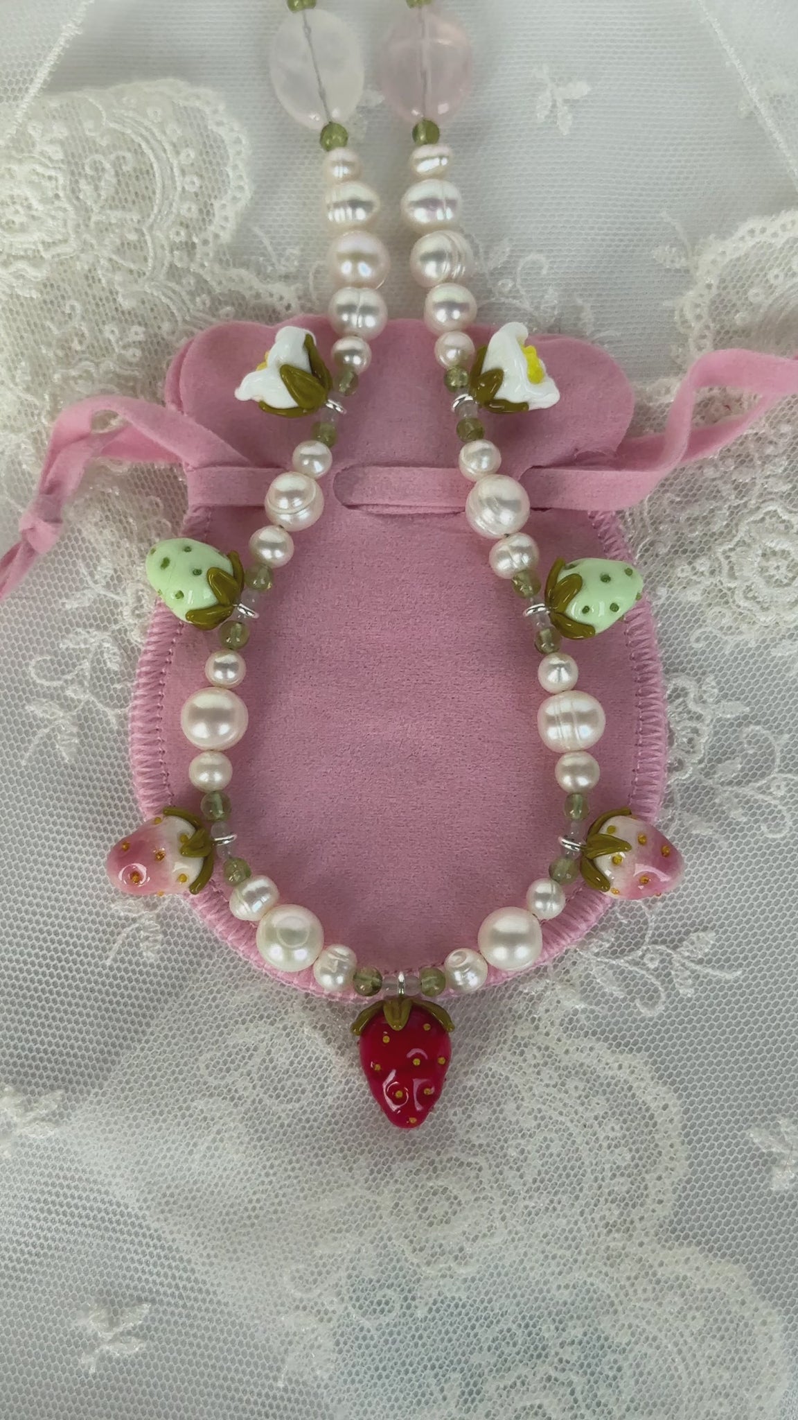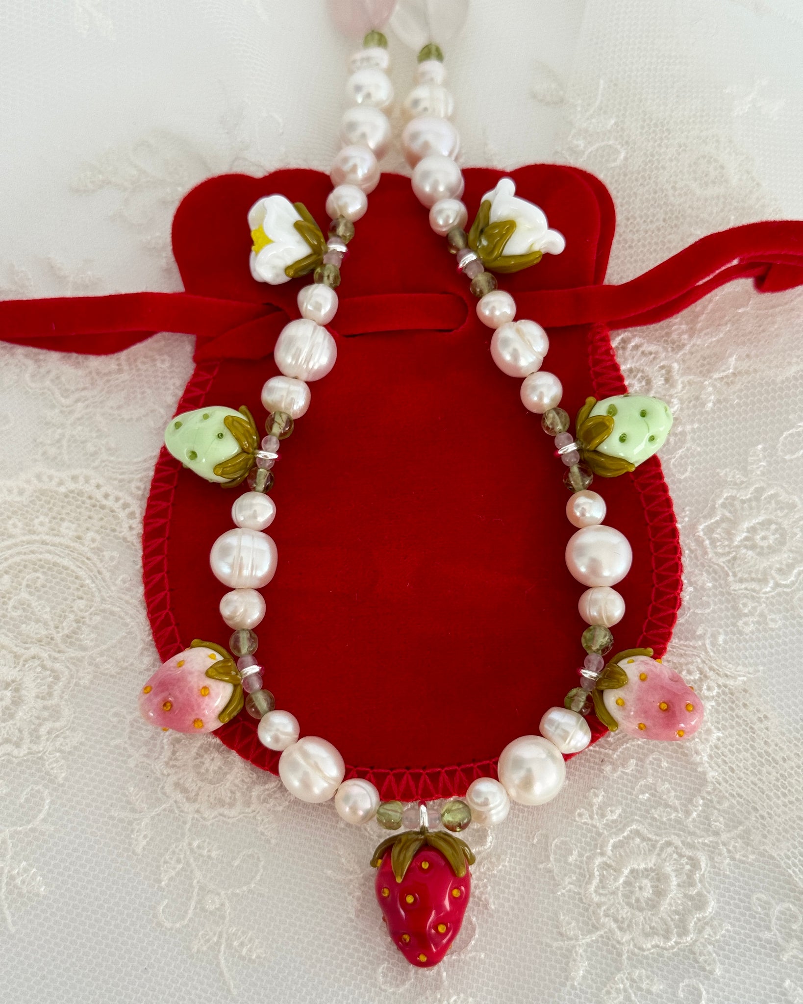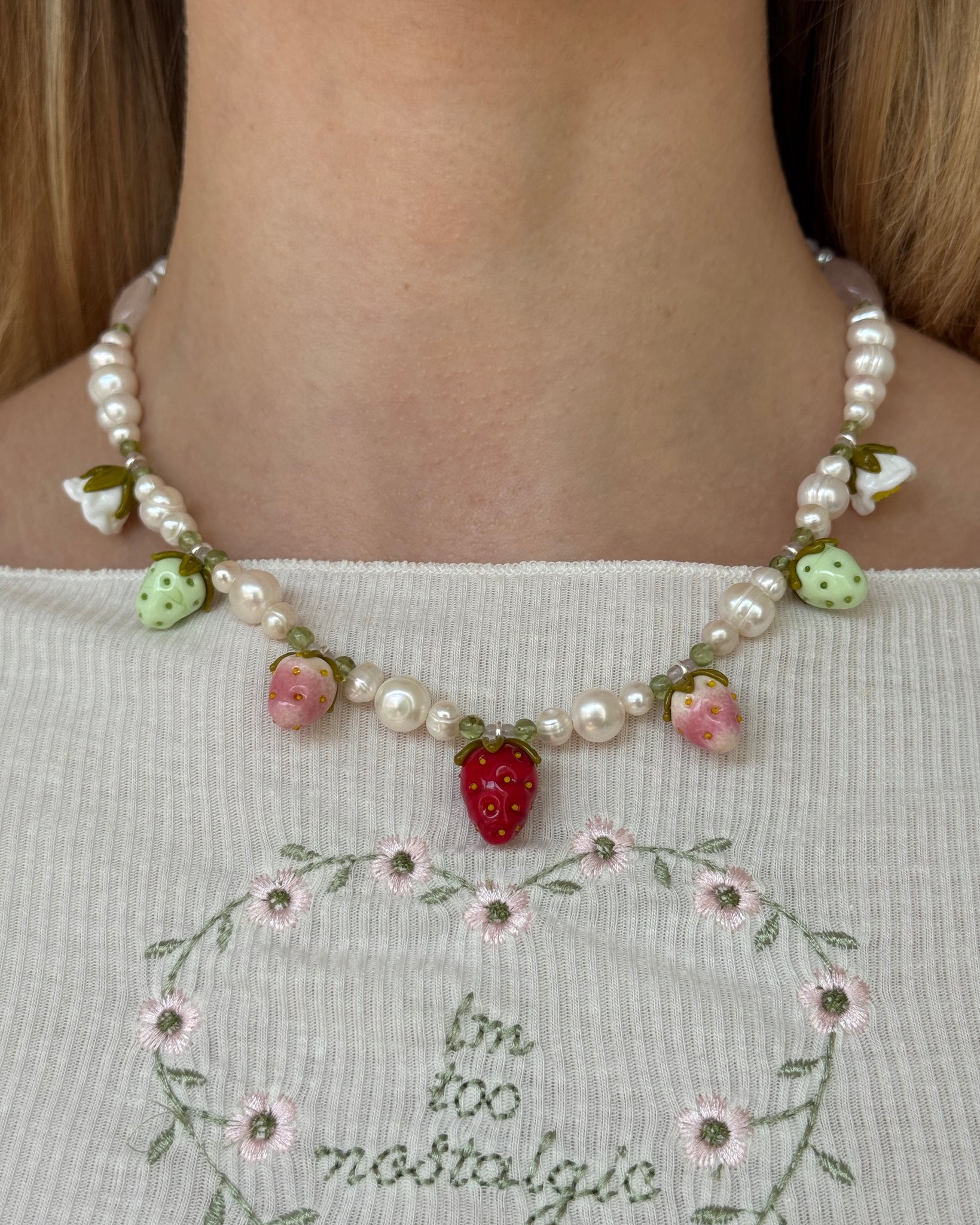 Fresh, playful, and full of charm. This piece is lovingly handcrafted with custom strawberry glass beads, handcrafted in Belgium. High-quality freshwater pearls, and genuine peridot and rose quartz gemstones, creating a vibrant and balanced mix of color and texture.