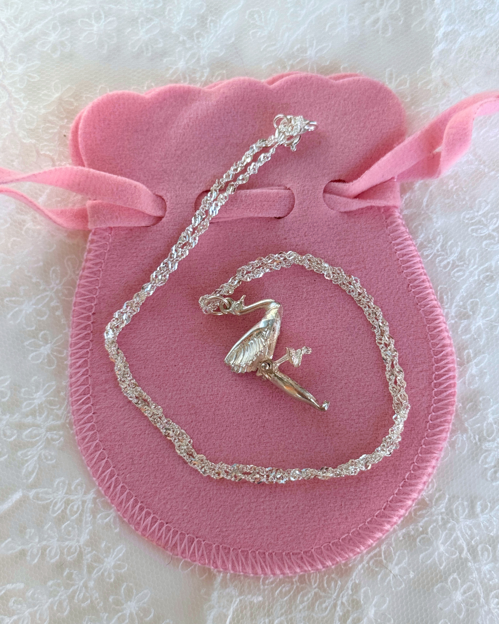 This vintage-sourced necklace features a swan charm crafted in 925 sterling silver, designed to open and reveal a ballerina inside.